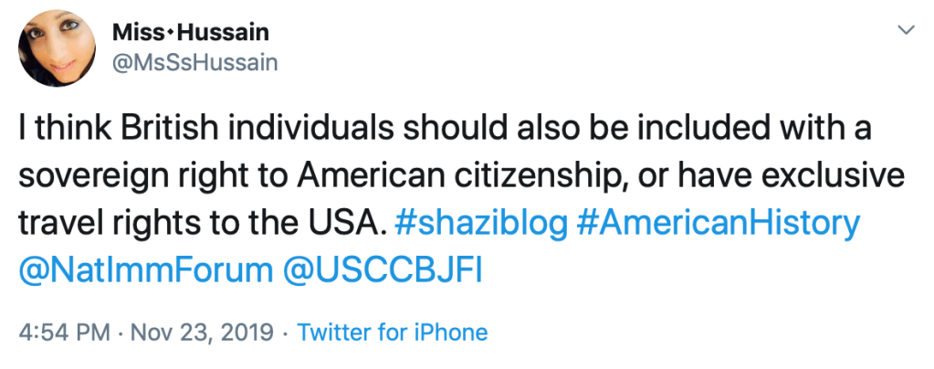 Of course we must recall the harsh histories of colonization and the claiming of territories, which will also bring the Indigenous, Natives, and the era of African slaves to the forefront. Maybe we all have a right to claim what and who we belong to? As belonging is one of the most arduous desires of the human being, soul and body. This very attachment / craving to place / land. Thus; the reason for my tweet. Maybe there is a possibility to re-visit immigration policy on both sides of the pond? America and Britain. As the marital union intimately unites both lands, which also call us to re-shape our historical view.