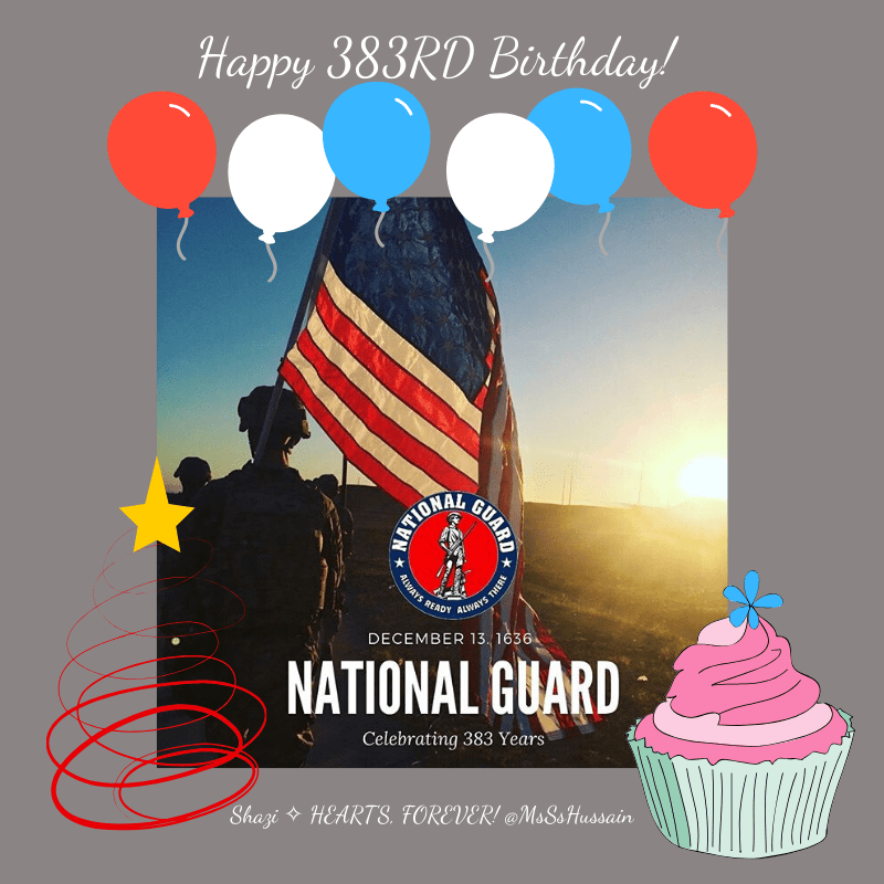 Congratulations to the National Guard who are celebrating their 383rd birthday today! On this day of celebration and everyday we continue to thank you for your service, you are always there, and have always been there to support and serve for 383 years! You are loved and celebrated! A historic birthday as the oldest known military branch for the Department of Defence! HAPPY 383RD BIRTHDAY US NATIONAL GUARD! 🙂