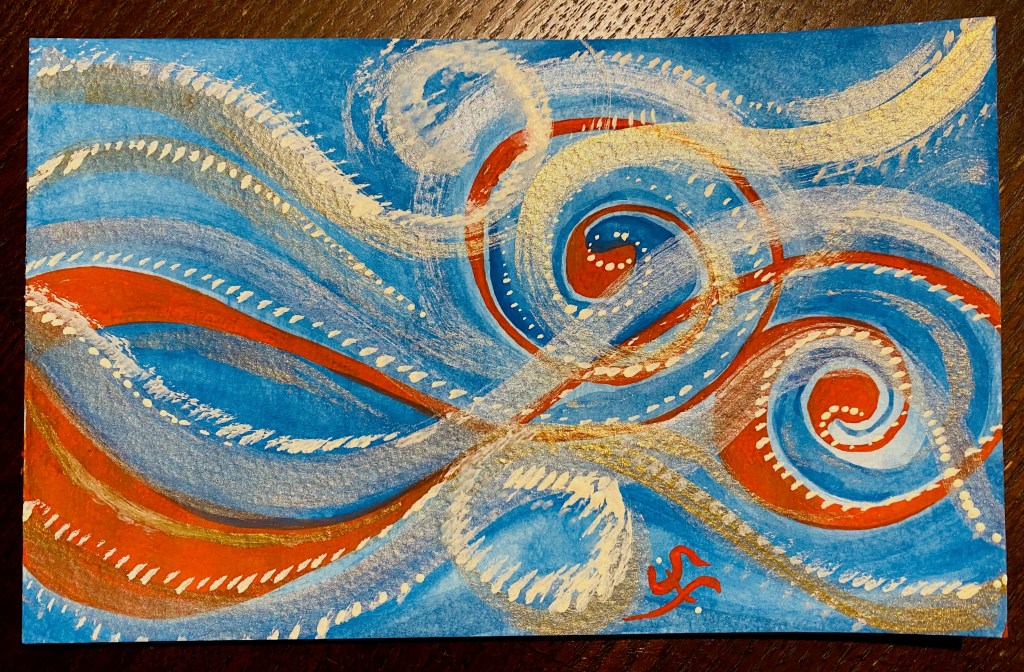 Spinal Waves seeks to reveal the human touching of spines, delicately curving and caressing. The layers created with the brush strokes envision layers of skin, delicate soft fabrics, creating waves as spines and skins are touching, through this abstract piece of art. The use of metallics gold and silver paint, and the small size of this piece are inspired by Frida Kahlo’s Mexican Votive style. Her small sized panels were usually created as a form of devotion. Spinal Waves is related to the poetry entitled: Spinal Curves!