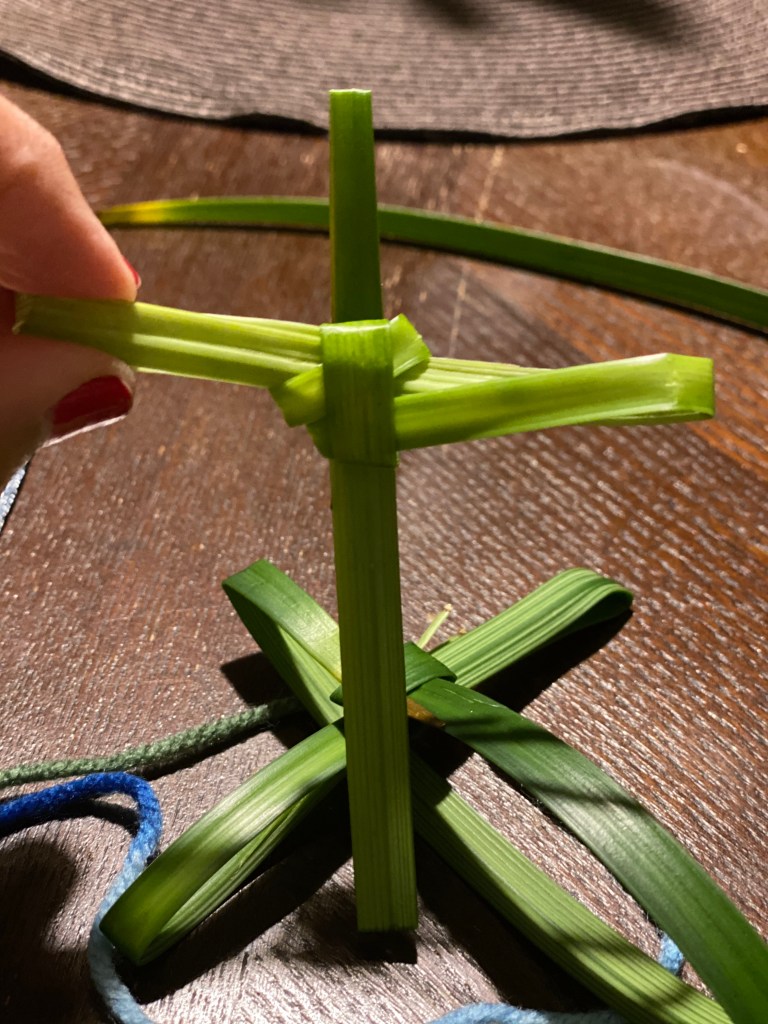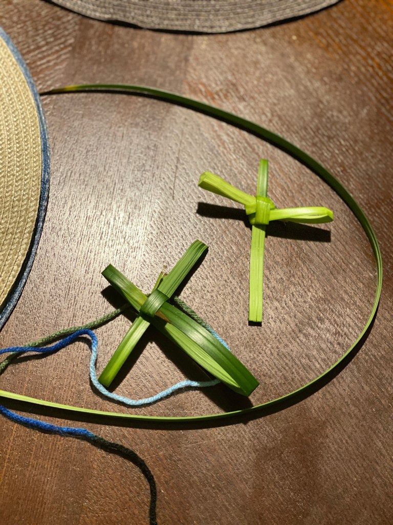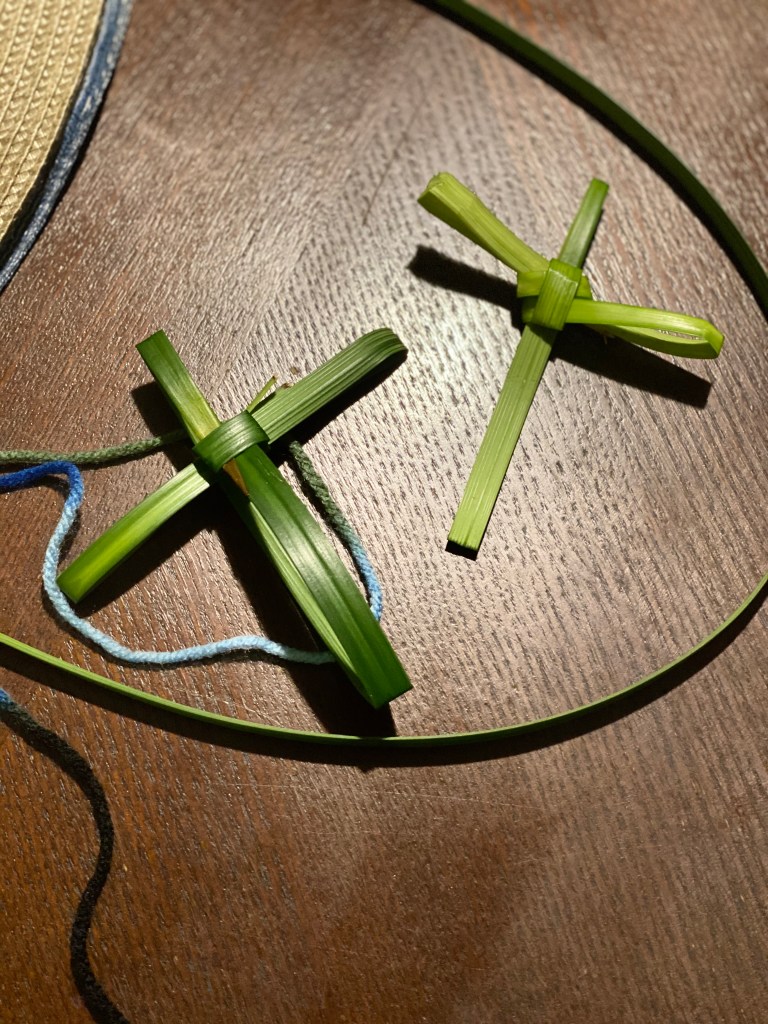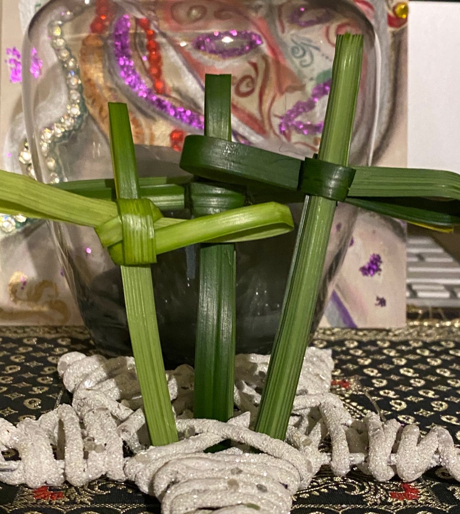This year I did not have any Palms, but I found some greenery within a flower bouquet and decided to make the symbol of a cross that actually do look a lot like a Palms. Palms are known to symbolize peace, victory and a great sign of respect. On this day instead of going out, we are called to walk within. To find and keep faith alive within, the temple of the body and soul.