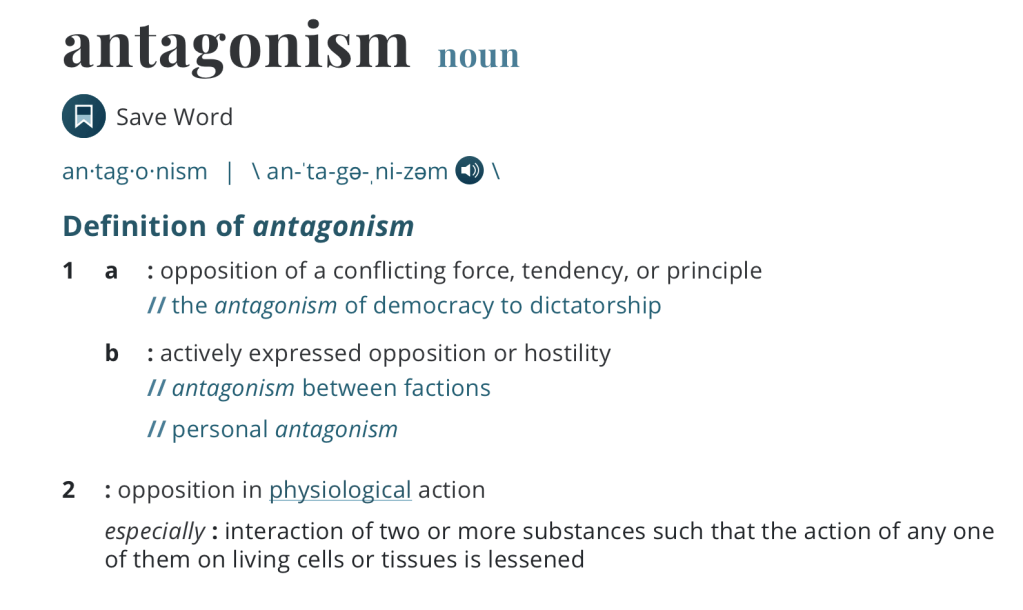 - Merriam-Webster. (n.d). Antagonism. https://www.merriam-webster.com/dictionary/antagonism