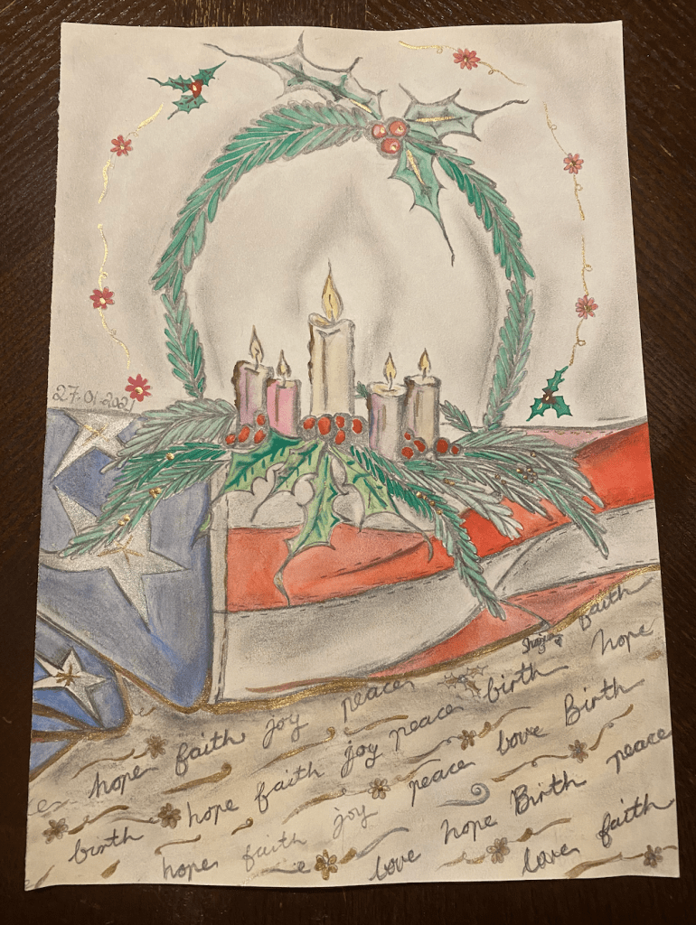 To capture the memory of the participation within the advent candle wreath for the 2020 Christmas season I decided to create the following pencil sketch, which I also look forward to adding some water-color soon. Please enjoy and share my memory of the Advent Candle Wreath 2020. Thank you!