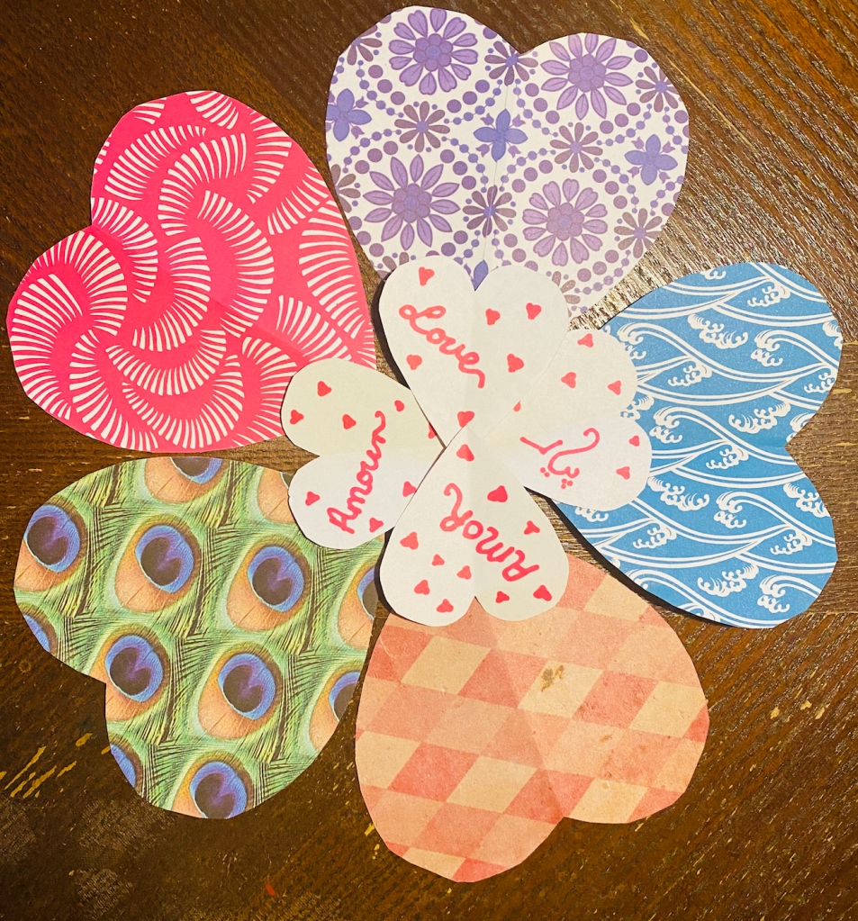 To echo the message of unity I created the following paper peace love hearts, with the word love written in the language of Urdu which is my mother tongue / native language, Spanish, French and English.