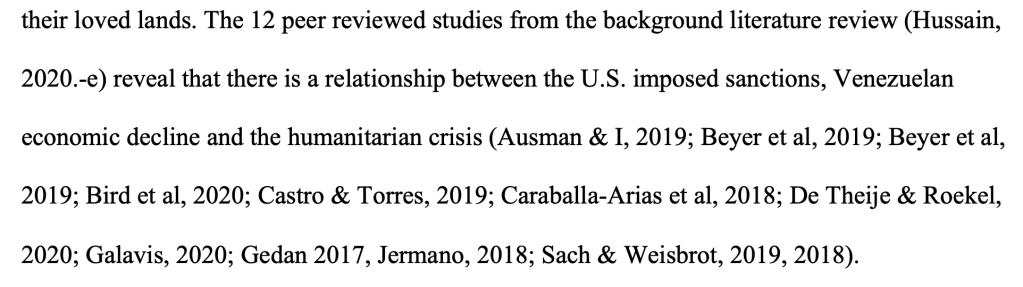 Hussain, S. S. (2020). The Impact of the Political and Humanitarian Crisis Upon the People of Venezuela. [Unpublished Manuscript]. The Chicago School of Professional Psychology.