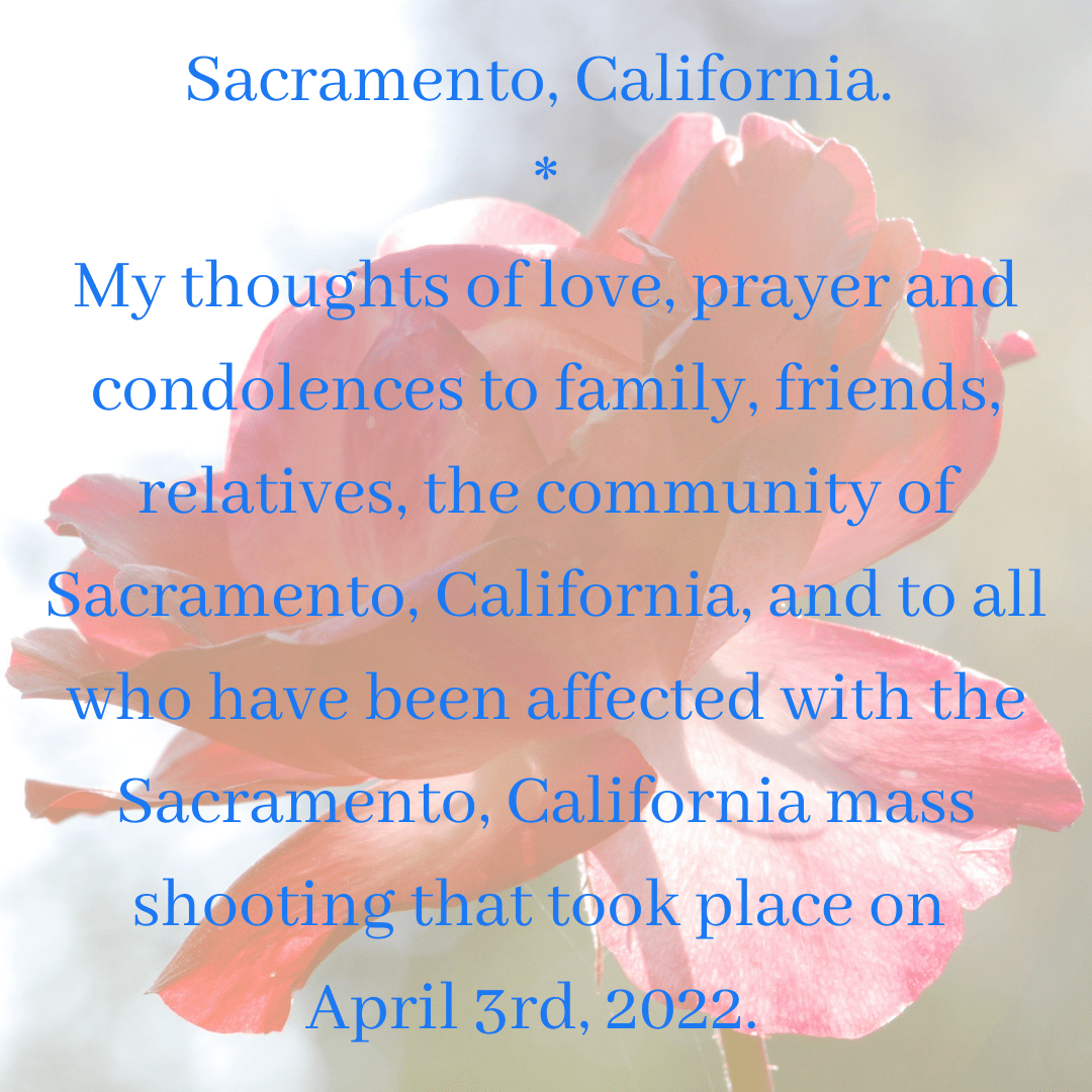 My thoughts of love, prayer and condolences to family, friends, relatives, the community of Sacramento, California, and to all who have been affected with the Sacramento, California mass shooting that took place on April 3rd, 2022. This shooting claimed the lives of six individuals and injuring twelve. It is during this difficult time I share my sympathies, love and support to once again reiterate condemning gun violence. My thoughts of love, prayer and sympathy, especially to all who are mourning close loved ones. May you find strength and healing, Amen.