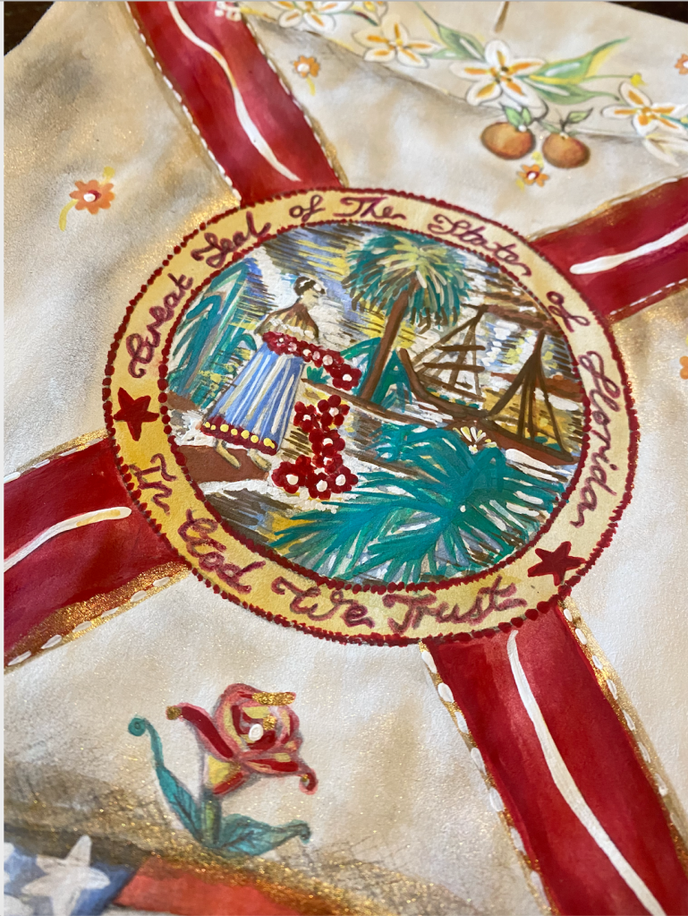 Please join me as I welcome the color version of our sketch entitled as: The Great Seal of Florida II! The numerics are an addition to the original title as a way to organize the pencil and color versions of the sketch. I truly enjoyed creating this colorful design, although I know there could be more improvements with the accuracy of the seal design, I think that I am impressed with the outcome of this first attempt. The colors are created with water-colors, pencil crayons, and enhanced with metallic paint.