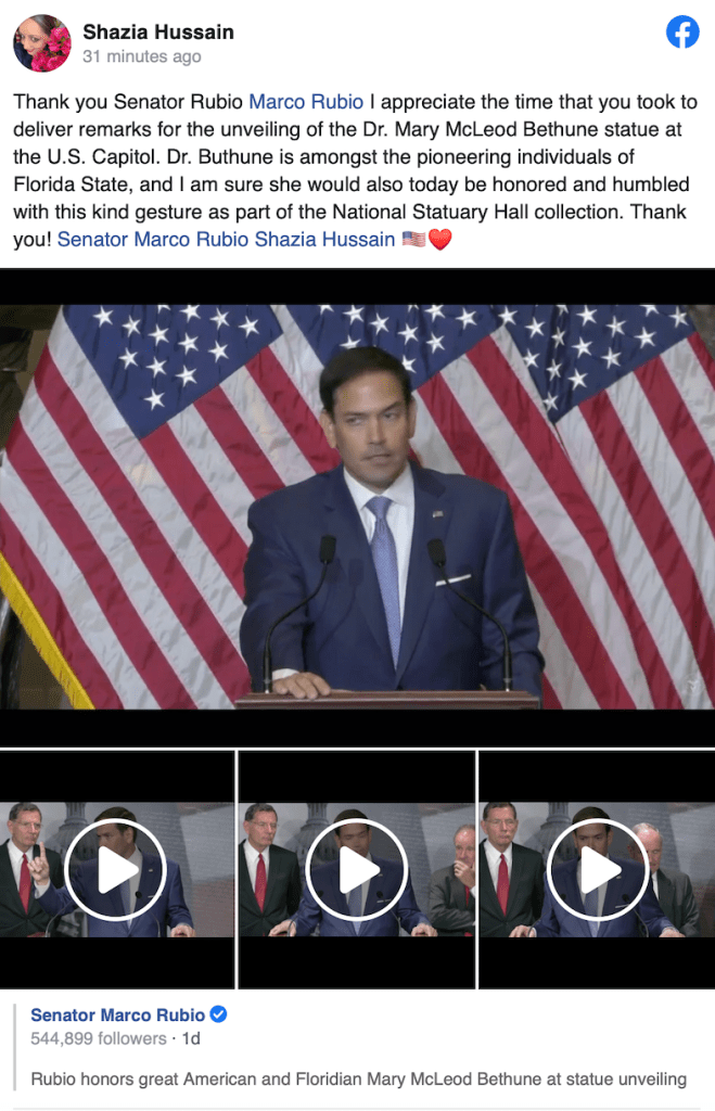 Thank you to all that made this ceremony possible. In a special way to thank Senator Marco Rubio (R-FL) for delivering your remarks, and representing the State of Florida. Florida is where Dr. Mary Jane McLeod Bethune was born, it is also why this statue was made possible by the approval of the Florida State Legislature and Governor of Florida. Thank you. Thank you also to House Speaker Nancy Pelosi (D-Calif.) who hosted the ceremony. House Minority Leader Kevin McCarthy (R-Calif.), Rep. Kathy Castor (D-Fla.), and Rep. Val Demings (D-Fla.) for your attendance of the ceremony.