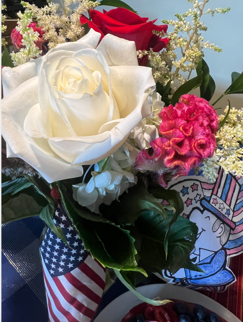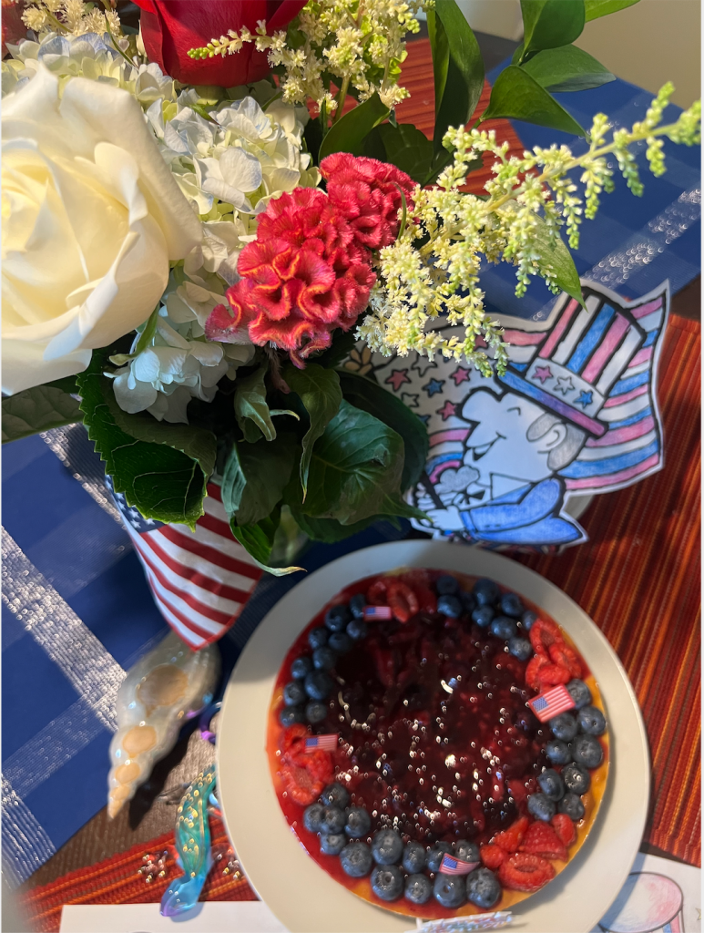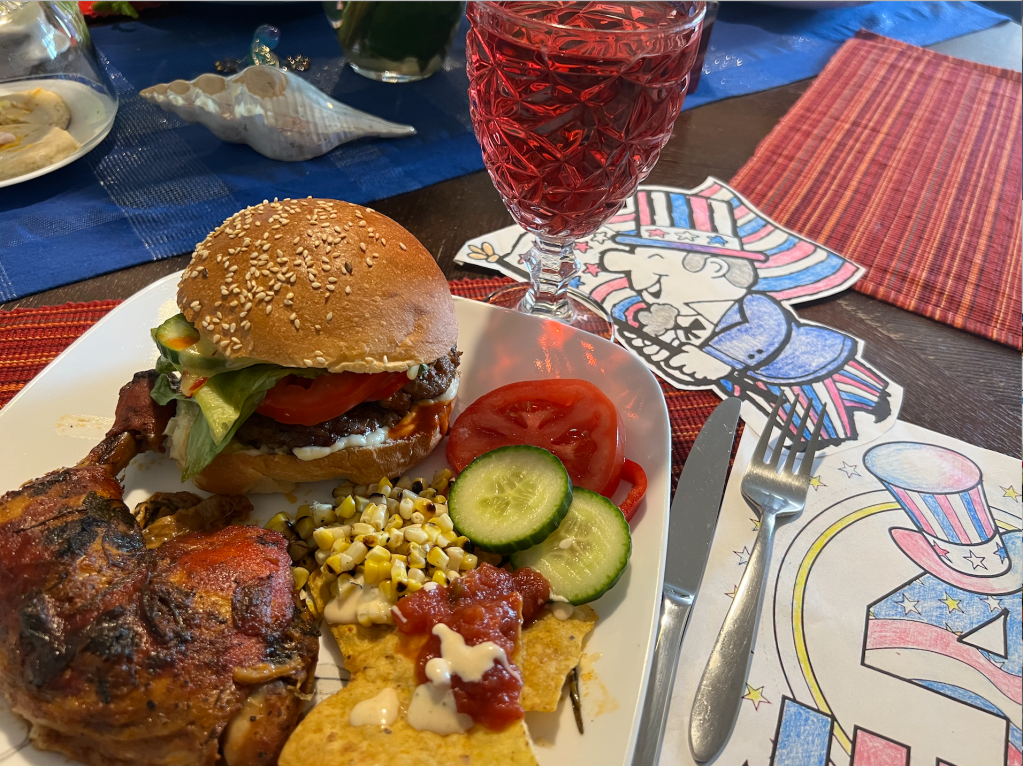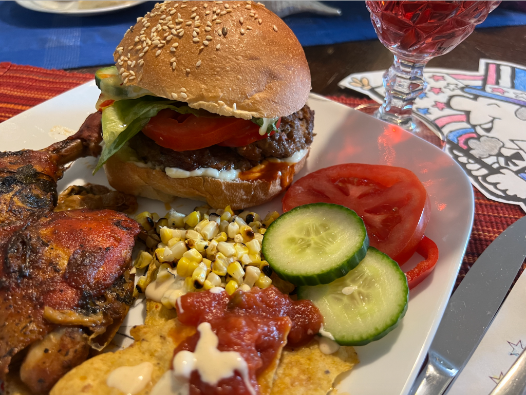 Please join me as I share our July 4th 2023, America’s Independence Day plate. I am grateful and thankful for our meal, and especially the yummy cheesecake. I created a burger and tried to make it a Texas-sized as possible. 🙂