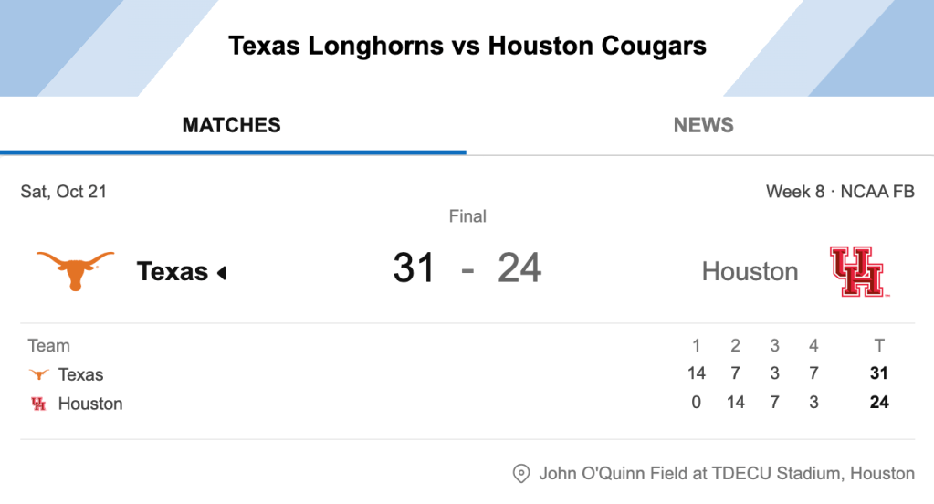 - Further Reading | Texas vs. Houston (Oct 21, 2023) Live Score – ESPN