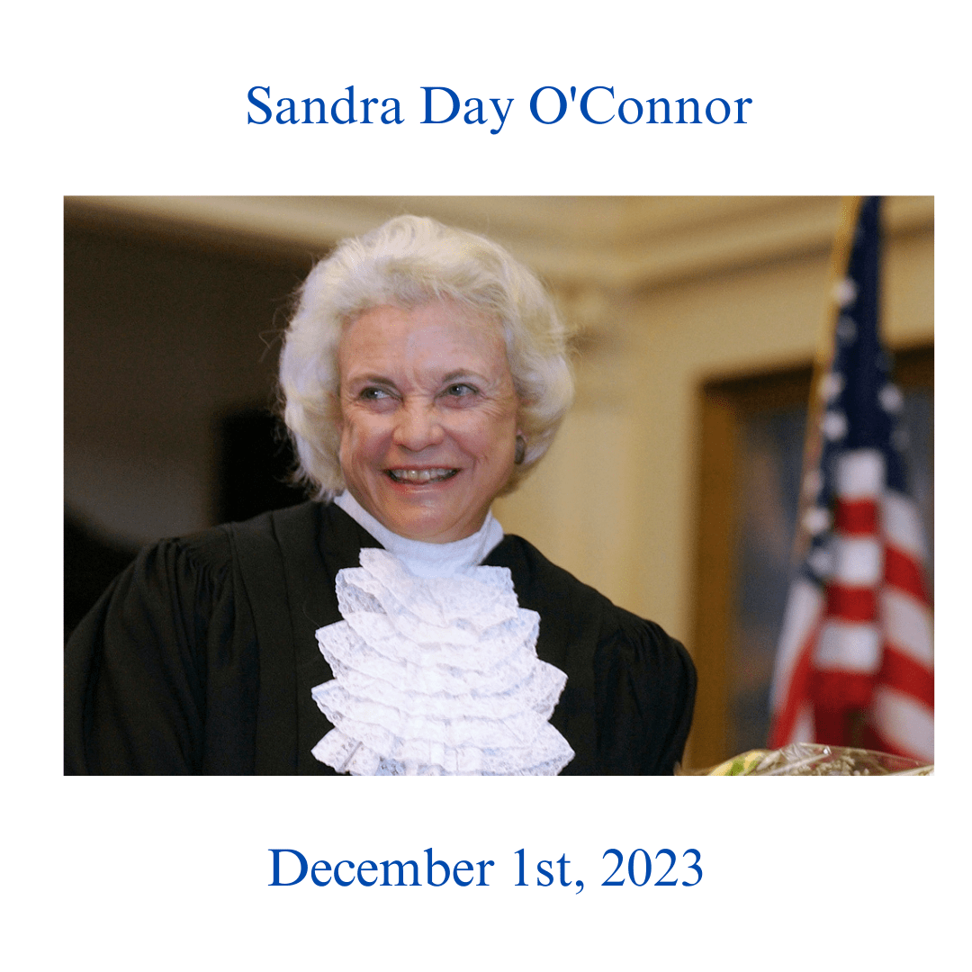 My thoughts of love, prayer and condolences to family, friends, loved ones, colleagues, the Supreme Court of the United States of America, and all who mourn the loss of Sandra Day O’ Conner. Ms.O’Conner was born in El Paso, Texas, USA on March 26th, 1930 and passed away on December 1st 2023. She served as an Associate Jurist for the Supreme Court of the United States of America, was a politician and American Attorney, she was known as the first female Associate Jurist for the United States of America.