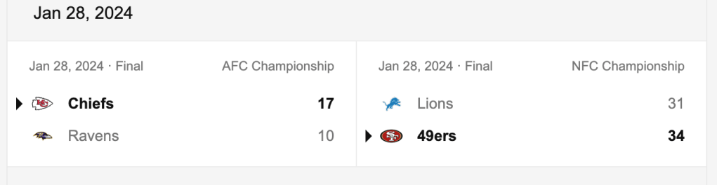 On the 28th of January 2024 it was the National Football League (NFL) Championship Sunday: Kansas Chiefs vs. Baltimore Ravens for the American Football Championship (AFC), and San Francisco 49ers vs. Detroit Lions for the National Football League (NFL).