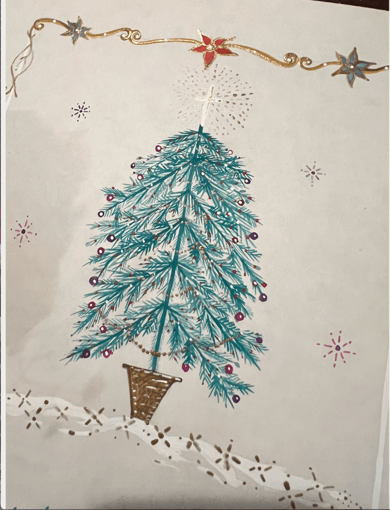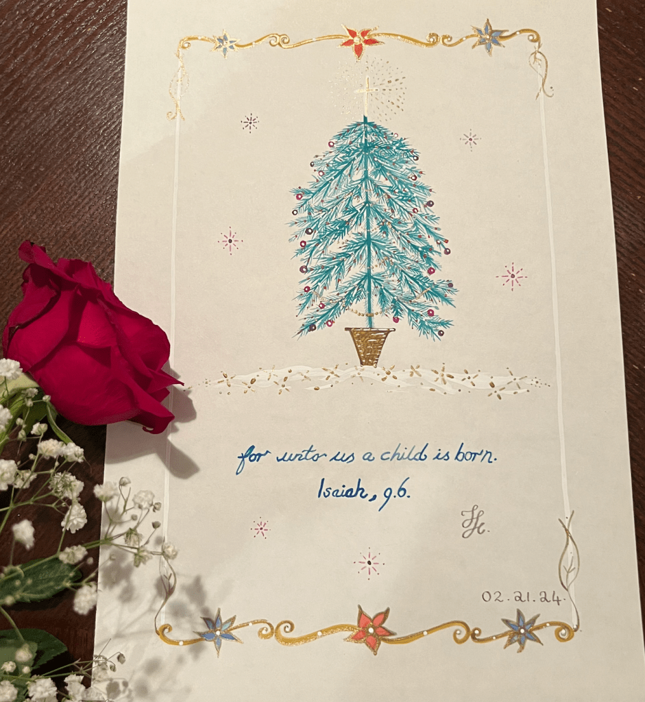 Please welcome the completion of the following art that seeks to continue to express and preserve the spiritual essence of the Christmas Advent Season 2023-24. Isaiah, 9.6. This is a Christmas tree watercolor pencil art sketch with metallics. I especially created the Christ Cross with a circular design to represent the most Holy Rosary of the Mother Mary. The bible verse is especially important to include in this art collection, to place emphasis upon the birth and celebration of Christ’s birth of Christmas. As well as the Christmas Tree that reminds me of having the Christmas tree lit through the Christmas Advent Season 2023-24. Shared with heartfelt love and kindness, i love you, in Christ. Te amo, en Cristo.
